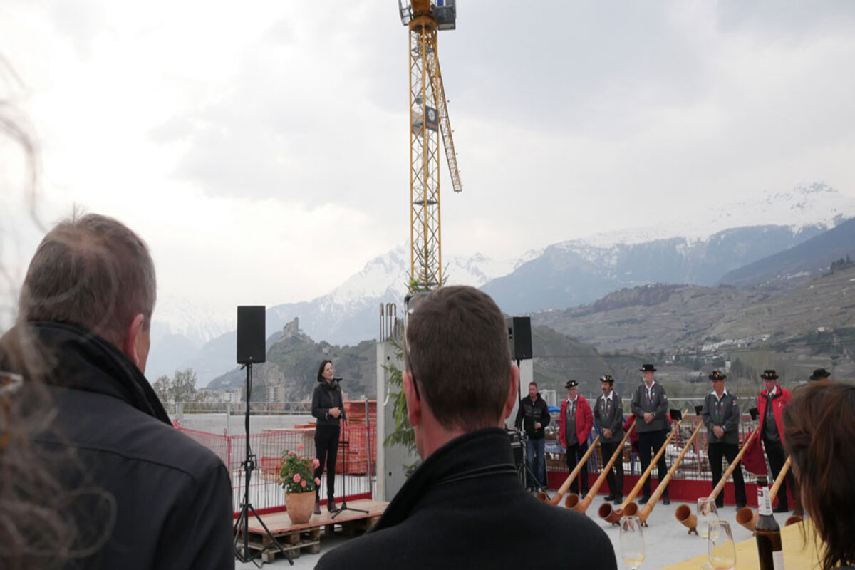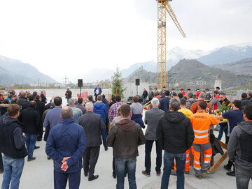 Cette cérémonie symbolique, en guise de remerciement pour le travail accompli, marque la fin de travaux du gros œuvre. Le soir du 2 avril, plus de 180 personnes se sont rassemblées sur le chantier : les représentants du maître d’ouvrage, les autorités cantonales et communales et surtout les ouvriers des entreprises, leurs sous-traitants et les mandataires.