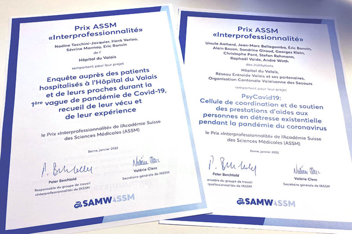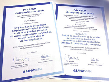 Pour son édition 2021, en pleine période de pandémie du coronavirus, l’ASSM a fait appel aux initiatives interprofessionnelles liées au COVID-19. Parmi les 36 requêtes soumises, l’ASSM a souhaité en récompenser 13, dont deux de l’Hôpital du Valais :