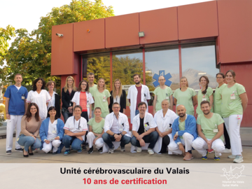 L’Unité cérébrovasculaire du Valais, qui fête ses 10 ans de certification cette année, offre une structure de pointe et une prise en charge globale des patients victimes d’AVC. Une décennie de dévouement et d'efforts soutenus pour fournir des soins de qualité à ceux qui en ont le plus besoin. Depuis nos débuts, nous avons travaillé sans relâche pour apporter à toutes les valaisannes, valaisans et hôtes de passage une unité performante et humaine qui sache au mieux répondre aux besoins et attentes des patients et familles confrontés à ces moments critiques.